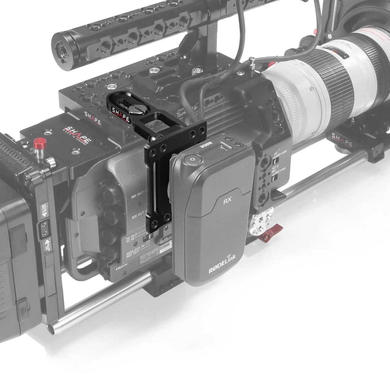 The SHAPE pivoting mounting plate is designed to mount portable wireless microphone, receivers, hard drive, wireless transmission system and other accessories to your camera. It can be mounted to any 1/4-20 or 3/8-16 threaded hole on your camera, cage, or cheese plate. It features an Anti-slip hook and loop buckle strap that cinches tight against your wireless receiver and presses into the deep rubber padded plate. It has a multiple ¼-20 thread holes on top and bottom for extra secure attachment. The wireless receiver mounting plate has a friction pivoting angled bracket with multiple mounting possibility. By pivoting up and down it doesn't obstruct any control button of your camera. The bracket for the mic receiver/accessories can be attached on the left or right side top or back of the camera.